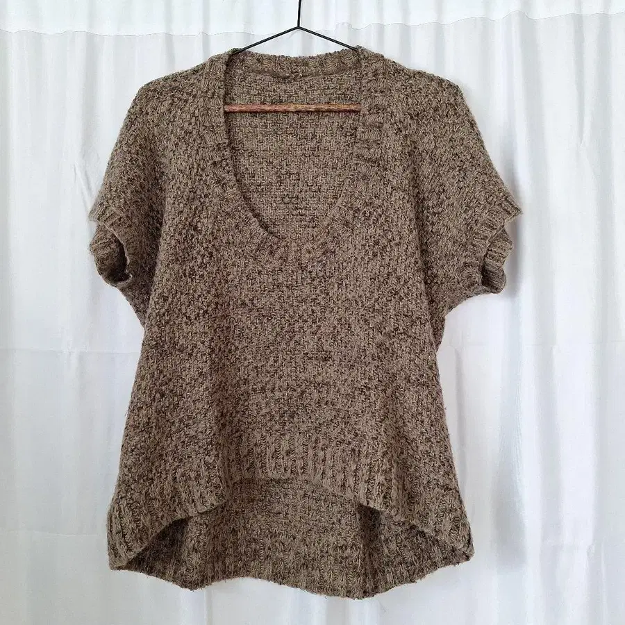 베이지 계열의 V넥 반팔 니트입니다. 뒷부분이 긴 디자인으로 쾌적한 착용감을 선사합니다. 가슴 너비 50cm / 기장 (앞) 51cm (뒤) 64cm 개인이 측정한 치수이므로 약간의 오차가 있을 수 있습니다. 양해 부탁드립니다. 방문해 주셔서 감사합니다.