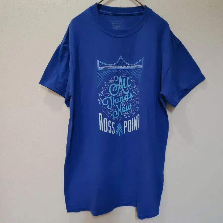 자동 번역되었어요. 원문보기파란색 코튼 T셔츠, 그래픽 프린트 디자인.