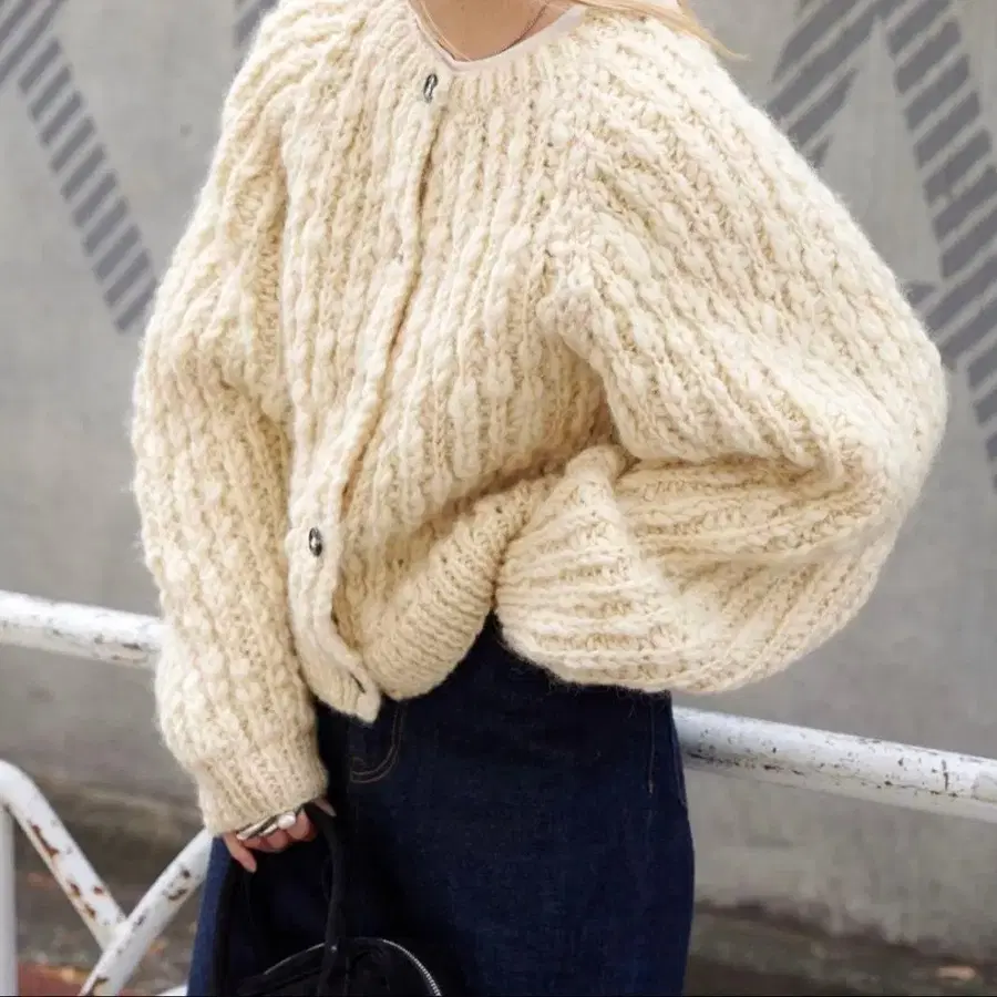 루니 오부소매 니트 가디건 고급 퍼프 슬리브 베이지 F