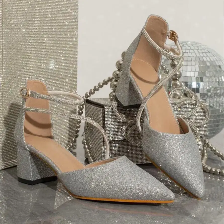 실버 글리터 마감의 스틸레토 펌프스, 힐 5.5cm로 엘레강트한 스타일. - 색상: 실버 - 디자인: 글리터 마감, 스틸레토 토 - 힐 높이: 5.5 cm - 사이즈: 26.5cm 파티에서 1회 착용했습니다. 방문해 주셔서 감사합니다.