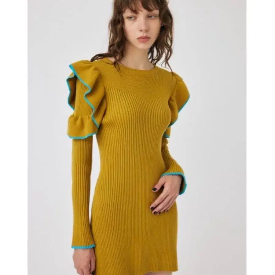프릴이 달린 머스타드 색상의 리브 니트 원피스, 긴팔과 타이트한 실루엣이 특징입니다. - 브랜드: MOUSSY - 색상: 머스타드 - 디자인: 프릴 장식, 리브 편직 - 소매 길이: 긴팔 - 스타일: 타이트 핏 방문해 주셔서 감사합니다.