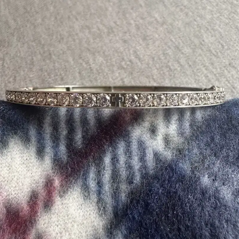 저스틴 데이비스의 뱅글입니다. 사이즈 L 최대 폭 약 3.8cm, 안지름 약 54 x 66mm, 두께 약 3.5mm, 안쪽 둘레 약 18.8cm. 컴플레인, 노 리턴으로 부탁드립니다. 편하게 질문, 할인 등 댓글 주세요.