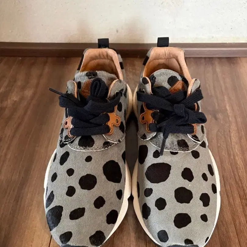 Flower MOUNTAIN (플라워 마운틴) 이라는 일본 브랜드의 제품일 가능성이 높습니다. 이 브랜드는 달마시안 무늬와 같은 독특한 도트 무늬를 특징으로 하는 모델을 여러 개 전개하고 있습니다. 상세 정보 브랜드명: Flower MOUNTAIN (플라워 마운틴) 특징: 그레이 색상의 원단에 불규칙한 검은색 점이 장식된 디자인으로, 종종 [달마시안 무늬]라고 불립니다. 신발끈을 통과시키는 부분에는 브라운 색상의 가죽 악센트가 있으며, 전체적으로 들어간 스티치 워크도 특징적입니다. 쿠션성이 있는 하얀색 밑창을 갖춘 로우컷 스니커즈 타입입니다. 스웨이드풍 도트 디자인이 특징인 스포티한 스니커즈. 레어 상품입니다! 방문해 주셔서 감사합니다. 사이즈 - 23.5cm
