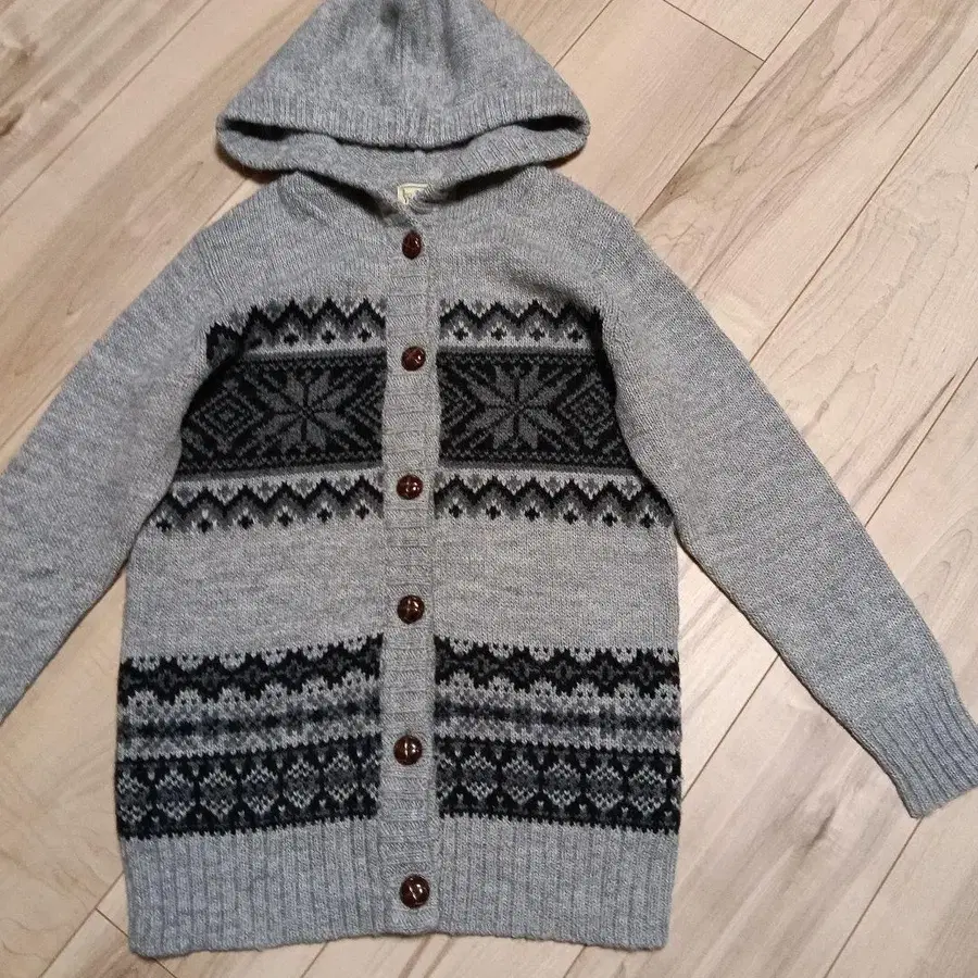 알파카 블렌드 소재의 후드 부착 니트, 그레이 색상의 패턴 디자인. - 브랜드: good day - 소재: 알파카 블렌드 - 사이즈: S - 디자인: 후드 부착, 버튼 부착, 패턴 - 색상: 그레이 [ 실측 평평하게 놓음 ] - 기장 65cm - 소매 길이 52cm - 어깨 너비 37cm - 가슴 너비 45cm 약간의 오차는 용서해 주십시오.
