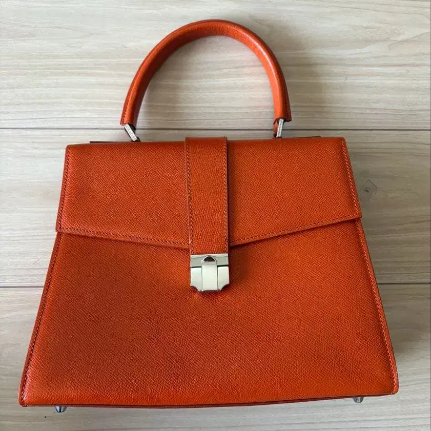 프랑스의 정통 브랜드, 모라비토의 오렌지색 가죽 소재 박스형 핸드백입니다.