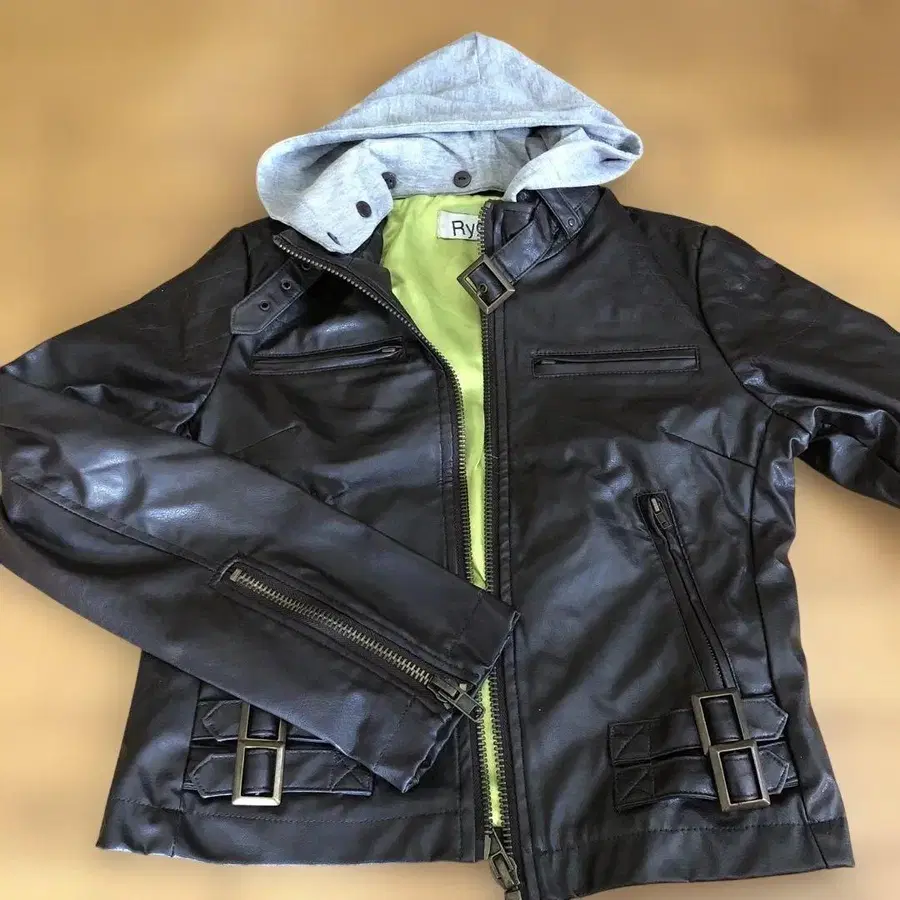 후드 부착 브라운 가죽 자켓, 안쪽은 선명한 옐로우 그린 색상. - 브랜드: Rydia - 색상: 브라운 - 소재: 가죽 - 특징: 후드 부착 탈부착 가능 - 안쪽 색상: 옐로우 그린 방문해 주셔서 감사합니다. 사이즈 - M