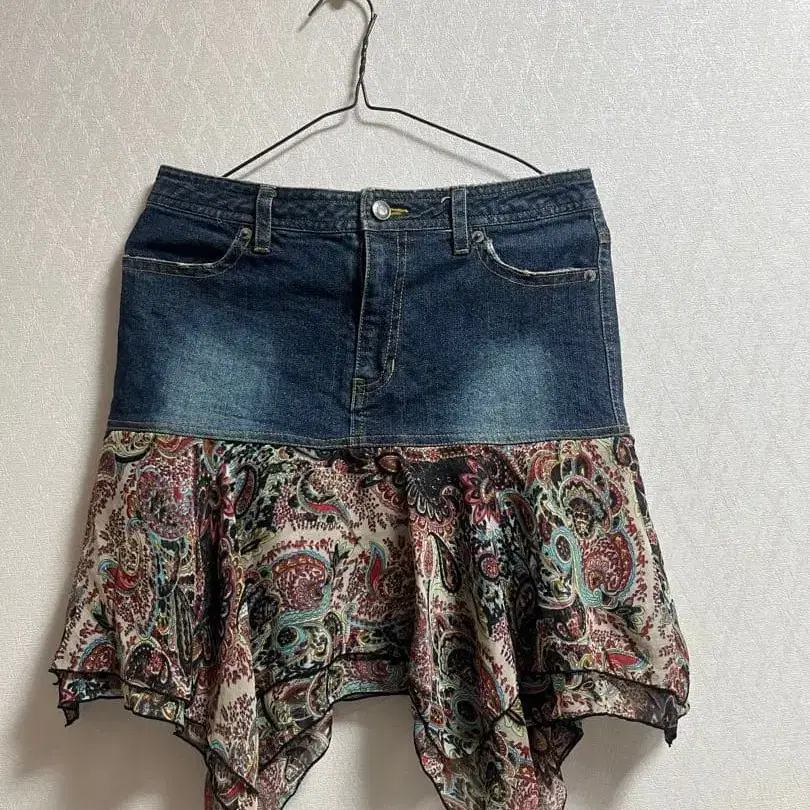 데님과 페이즐리 무늬의 프릴 스커트, 스타일리시하고 개성 있는 디자인. - 디자인: 데님과 페이즐리 무늬의 하이브리드 스커트 - 스타일: 프릴 장식 - 컬러: 데님 블루와 멀티 컬러 - 소재: 데님과 쉬폰 - 포켓: 백 포켓 있음 방문해 주셔서 감사합니다. 사이즈 - FREE SIZE