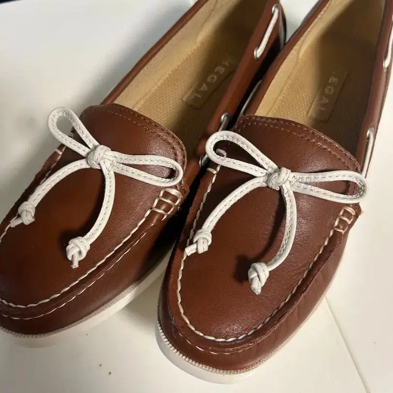 브라운 가죽 로퍼, 화이트 리본 포함. - 브랜드: REGAL - 색상: 브라운 - 디자인: 로퍼 - 소재: 가죽 - 장식: 화이트 리본 방문해 주셔서 감사합니다. 사이즈 - 22.5cm