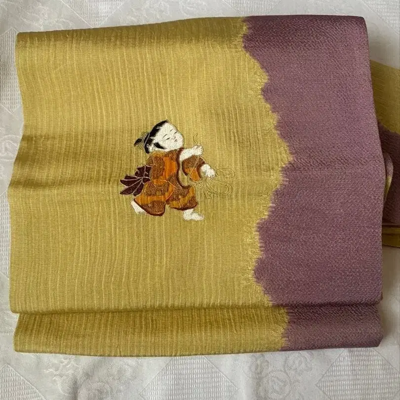 노랑과 보라색의 그라데이션에 동자 자수가 놓인 나고야 오비. - 색상: 노랑과 보라색의 그라데이션 - 디자인: 어린이 자수 - 소재: 실크 - 스타일: 나고야 오비 방문해 주셔서 감사합니다.
