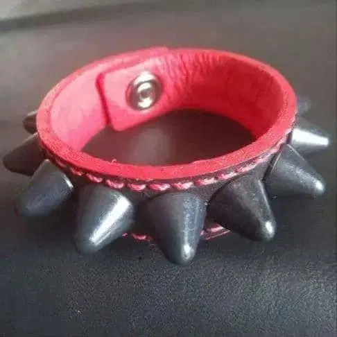 본인이 핸드메이드로 제작한 높이 11밀리미터의 톨 콘 스터드를 사용한 본 가죽제 리스트 밴드입니다. 가죽 색상은 블랙이며, 손바느질 스티치와 안감 가죽은 빨간색, 스터드는 페인팅이 아닌 다알 블랙 가공된 것입니다. 폭 20밀리미터. 이미지는 샘플이므로 구매를 희망하시는 분은 손목 둘레 사이즈를 측정하신 후 댓글로 알려주세요. 단품 구매 시 가격 인하 협상은 대응하지 않습니다.