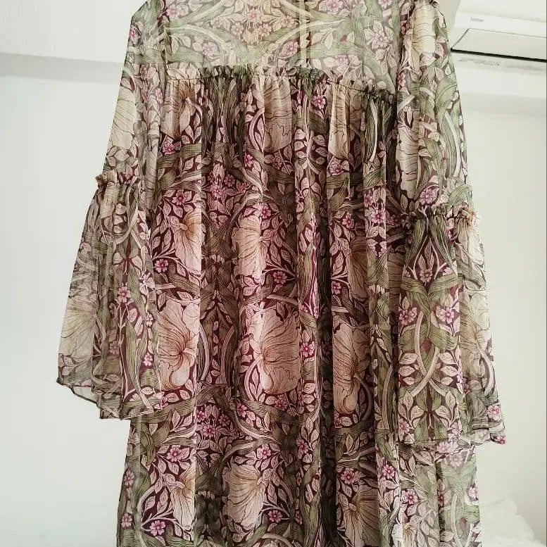 봐주셔서 감사합니다. 플레어 슬리브의 보헤미안 스타일 튜닉 상의입니다. 비침이 있는 소재이지만, 가슴 부분부터 아래는 안감이 있습니다. 뒤집은 상태의 사진을 마지막에 첨부했으니 확인해 주세요. 겉감의 베이스 컬러와 안감의 색상은 버건디입니다. 상품 기재 사이즈 44 가슴 너비 약 55cm 기장 약 90cm