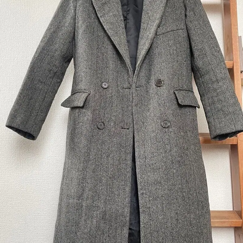헤링본 무늬의 더블 브레스트 롱 코트, 울 혼방 소재로 따뜻함과 스타일을 겸비했습니다.