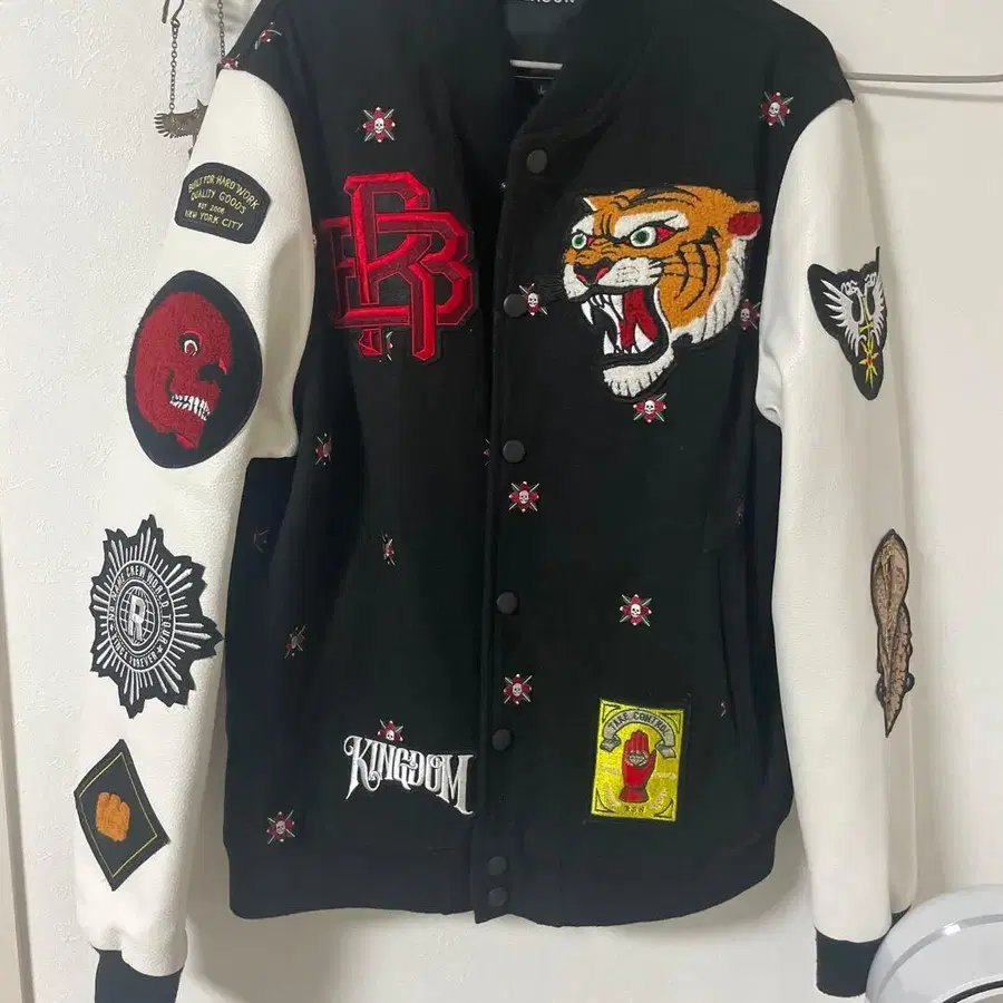 호랑이 자수와 다채로운 패치가 특징인 바시티 자켓. - 브랜드: REASON - 디자인: 자수入り 바시티 자켓 - 컬러: 블랙/화이트 - 특징: 호랑이 자수, 복수의 패치 - 안감: 매끄러운 소재 방문해 주셔서 감사합니다. 사이즈 - L