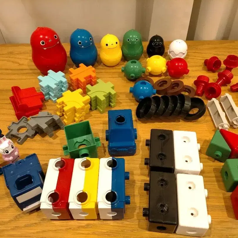 아이 챌린지 [입체 패널 블록+챌린지 원 인형] 블록으로 길을 만들고 자동차에 인형을 태우면 자동차가 길을 따라 달립니다. 블록을 입체적으로 조립하여 자동차를 만들 수도 있습니다. 호비(시마지로)와 이누코 선생님의 뒤통수, 토리삐의 눈 페인팅 벗겨짐 있습니다. [색깔 모양 블록, 나사 블록+이로삐] 블록으로 자동차나 기차를 만들고 이로삐를 태워 놀았습니다. 이로삐는 마트료시카와 같은 구조로 되어 있습니다. 시계 부품처럼 돌리거나 쌓아 올릴 수도 있습니다. 블록에 닿아 이로삐의 얼굴이 벗겨진 부분이 있습니다.