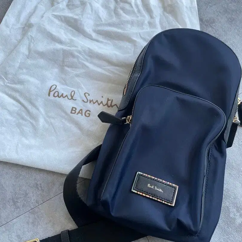 네이비 색상의 나일론 소재 숄더백, 지퍼 포켓 있음, 수납 봉투 포함.