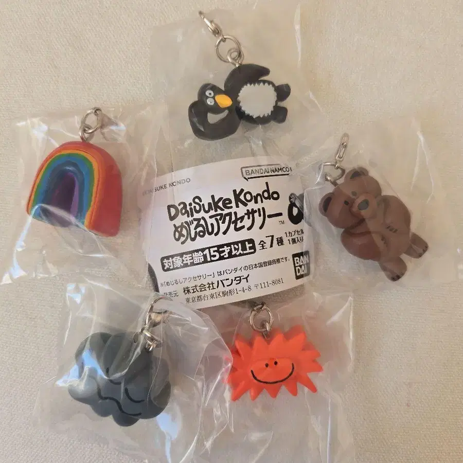 DaisukeKondo 표시 액세서리 5개 세트입니다. kuma(곰) pengin(펭귄) dokodemoniji(무지개) kumo(구름) taiyo(태양) 우편으로 발송하므로 잘 부탁드립니다.