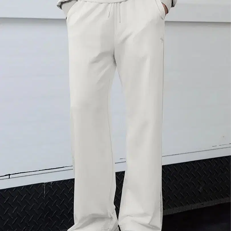 사이드 라인이 특징인 화이트 조거 팬츠, 맨투맨 소재로 쾌적한 착용감.
