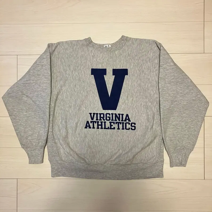 USA제 트리코 태그 80's 리버스 위브입니다. 버지니아 대학의 애슬레틱 제품입니다. 그레이 바디에 블루 삼단 러버 프린트, V 대문자가 박력 있으며 최고입니다.