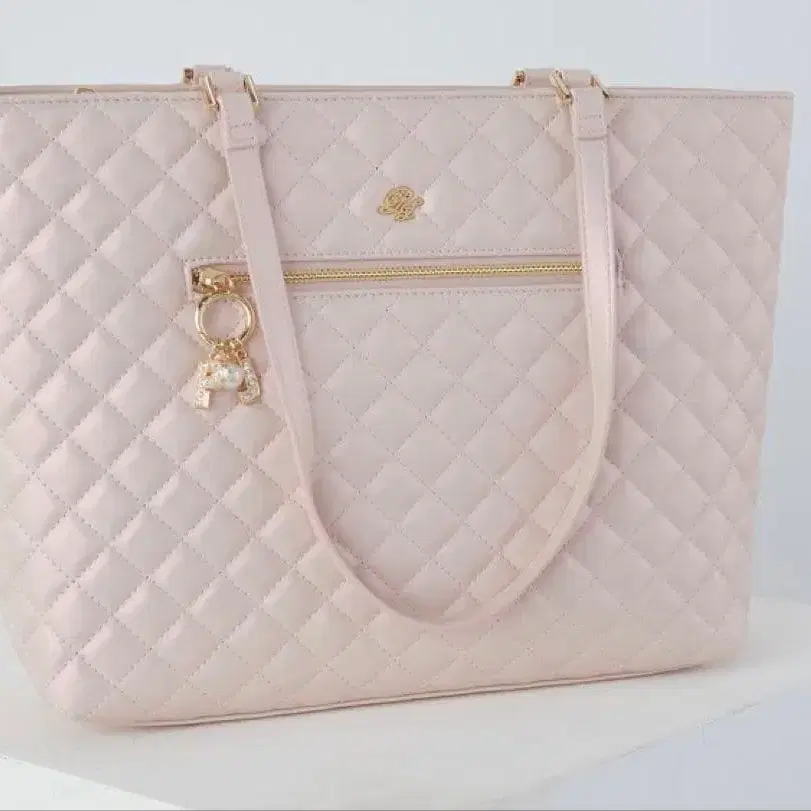 퀼팅 디자인의 핑크 토트백, 외부에 지퍼 포켓이 있어 편리합니다.
