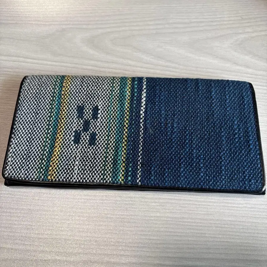 스트라이프 무늬의 텍스타일과 가죽 장지갑, 카드 슬롯과 지퍼가 달린 포켓을 갖춘 실용적인 디자인.