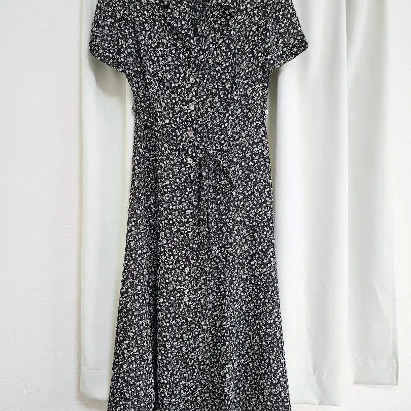 롱 원피스 발목 기장 어깨 패드 있음 허리끈 포함 안감 없음 블랙 바탕에 화이트 미니 꽃무늬 사이즈 기준 cm 총장 115 가슴둘레 90 어깨 너비 37 폴리에스테르 100%