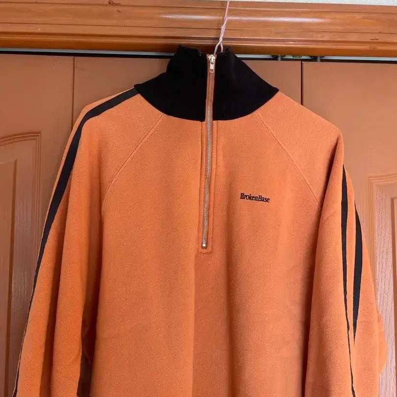 오렌지 색상의 플리스 소재, 하프 지퍼 디자인의 트레이닝복.