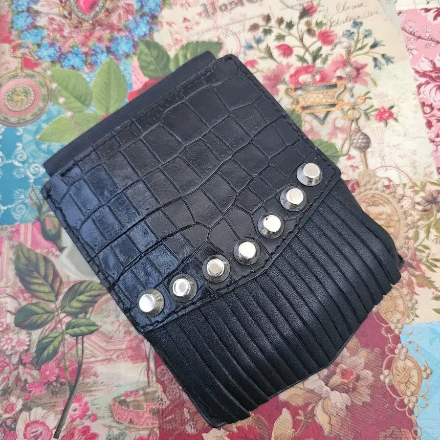 F.E.A.R 브랜드의 크로커다일풍 디자인 블랙 접이식 지갑, 스터드 장식 포함.