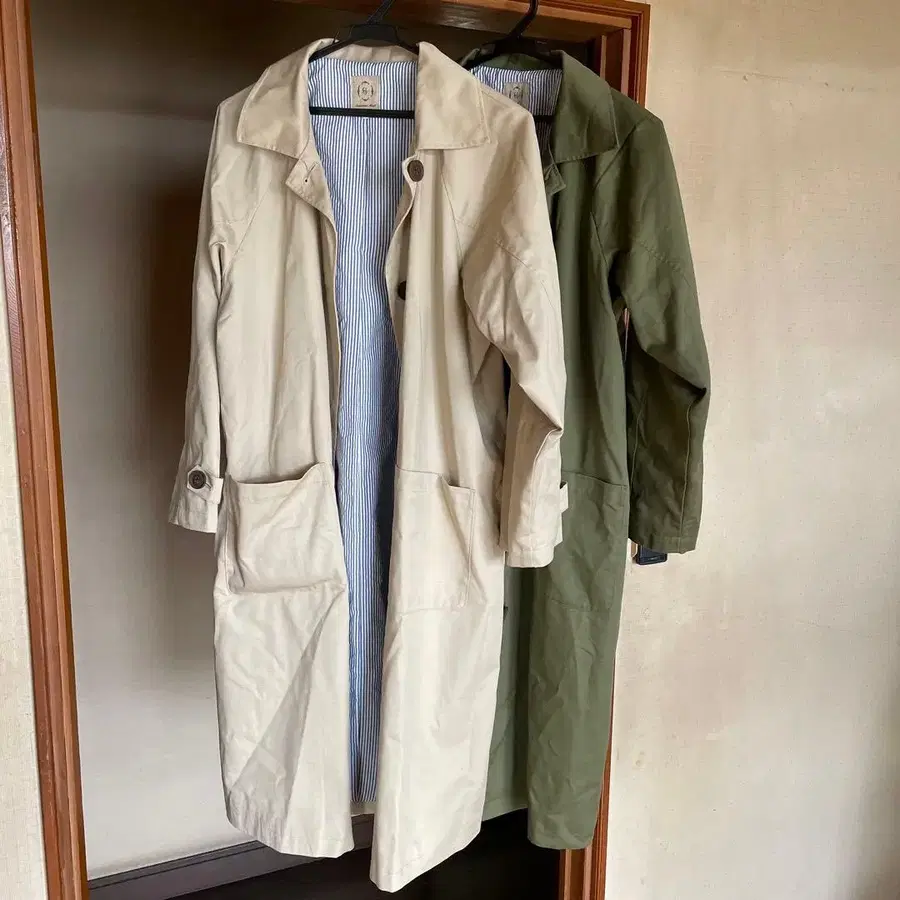 아이보리와 카키 트렌치코트, 경량으로 봄에 최적화된 소재. - 색상: 아이보리 - 색상: 카키 - 소재: 폴리에스테르 65%, 코튼 35% ※ 베이지 2회 사용. ※ 카키 2, 3회만 사용. 사용 횟수는 상당히 적지만, 자택 보관했습니다. 이해하신 분만 구매 부탁드립니다. 방문해 주셔서 감사합니다. 사이즈 - FREE SIZE