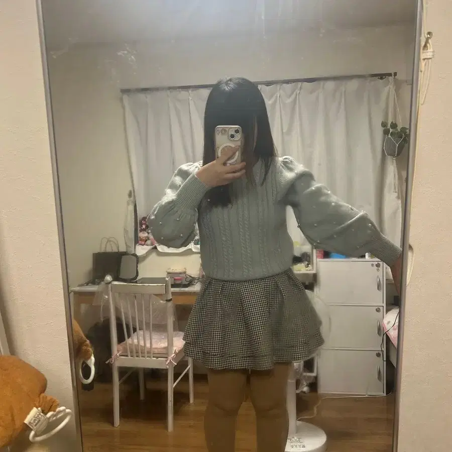 스카이블루 색상의 케이블 짜임 니트, 펄 장식, 벌룬 소매 디자인. - 색상: 스카이블루 - 디자인: 케이블 짜임, 펄 장식 - 스타일: 캐주얼 - 소재: 니트 - 스커트 디자인: 깅엄 체크 - 소매 스타일: 벌룬 소매 스타일이 바뀌어서 판매합니다. 1~2회 착용 방문해 주셔서 감사합니다. 사이즈 - FREE SIZE