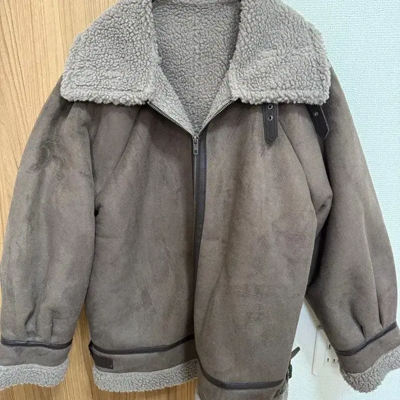 무스탕 소재의 지퍼 달린 코트, 안감은 보아 소재로 따뜻합니다. - 색상: 그레이 - 소재: 무스탕 - 디자인: 지퍼 달린, 카라 부착 - 특징: 안감에 보아, 소매에 장식 있음 압축하여 발송합니다. 방문해 주셔서 감사합니다.
