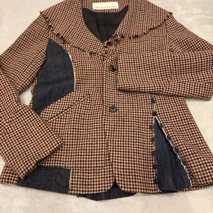 체크 무늬와 데님의 유니크한 콤비네이션 테일러드 자켓. 리메이크 제품입니다. - 브랜드: sunaokuwahara - 디자인: 체크 무늬와 데님 콤비네이션 - 스타일: 테일러드 자켓 - 색상: 브라운 계열 - 특징: 프릴 옷깃과 유니크한 절개 디자인 방문해 주셔서 감사합니다. 사이즈 - M
