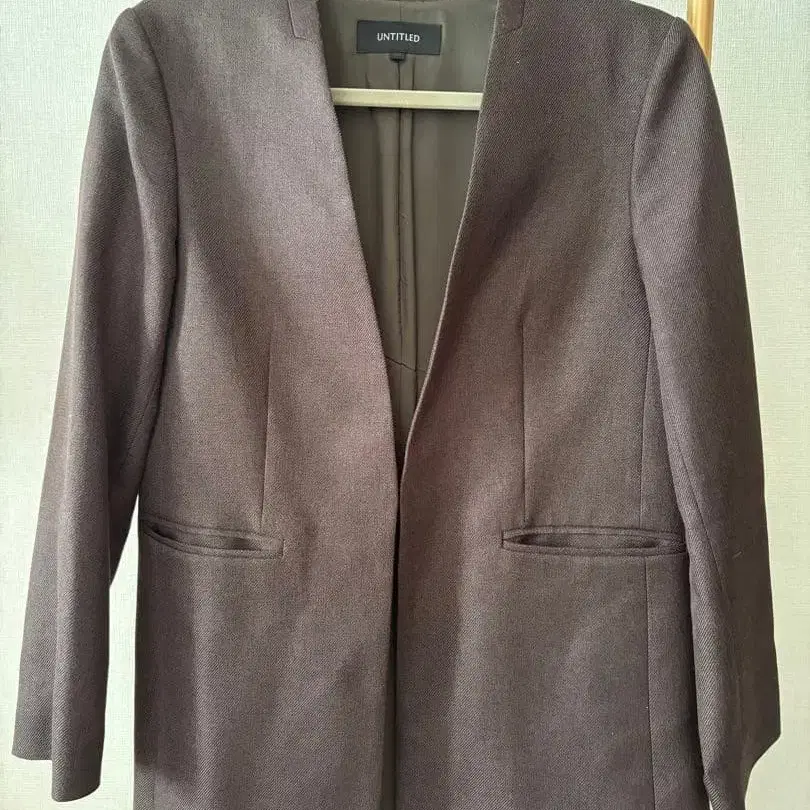 언타이틀의 노카라 자켓입니다. 사용감은 있지만, 보풀이나 얼룩 등은 없습니다. 가로 길이는 약 45cm, 기장은 약 72cm이며, 색상은 브라운입니다. #UNTITLED #언타이틀 #노카라자켓 #수트 #자켓
