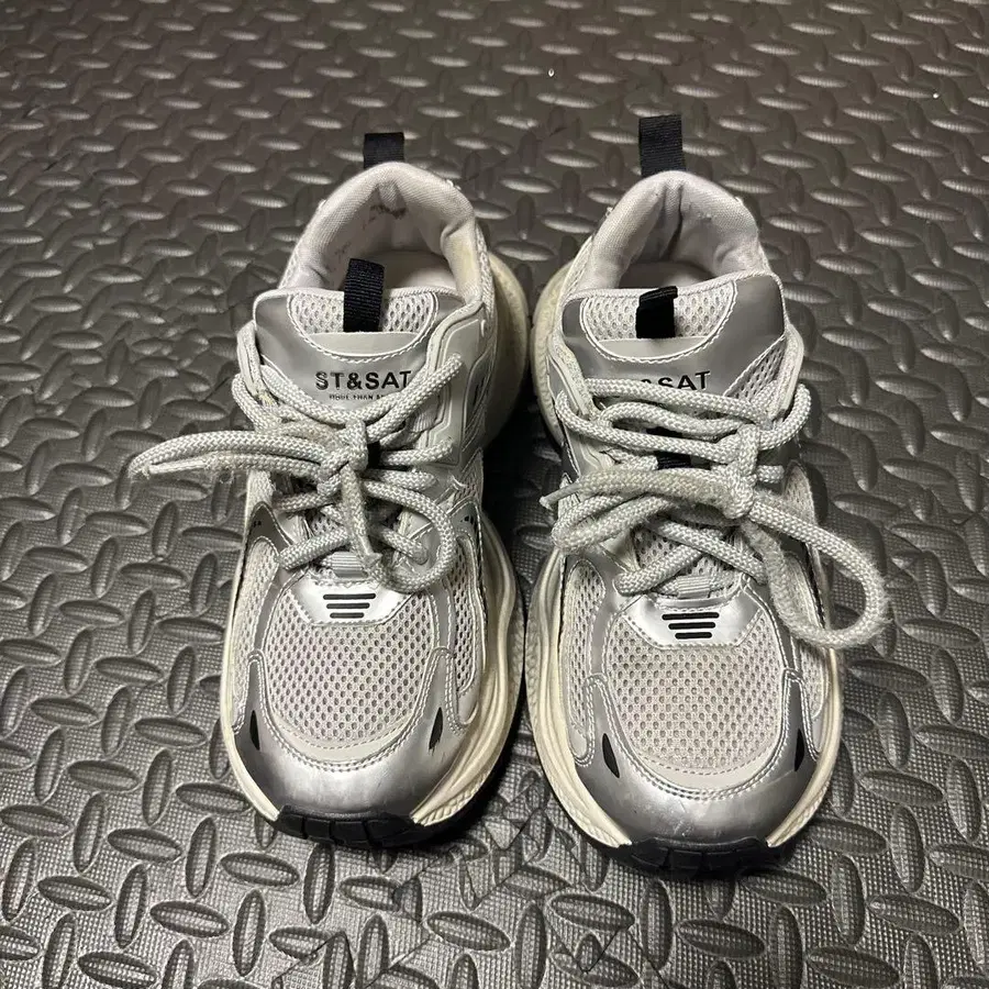 실버와 화이트 메쉬 스니커즈, 하트 모양의 밑창 디자인이 특징. - 브랜드: ST&SAT - 색상: 실버/화이트 - 밑창 디자인: 하트 모양 패턴 - 백 탭: 블랙 백 탭 - 소재: 메쉬/합성 피혁 방문해 주셔서 감사합니다. 사이즈 - 23cm