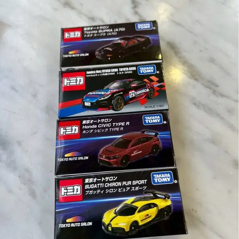 봐주셔서 감사합니다. 도쿄 오토 살롱 시리즈 미니카 세트, Honda Civic Type R, Bugatti Chiron Pur, Toyota 수프라 GR86 4대 세트입니다.