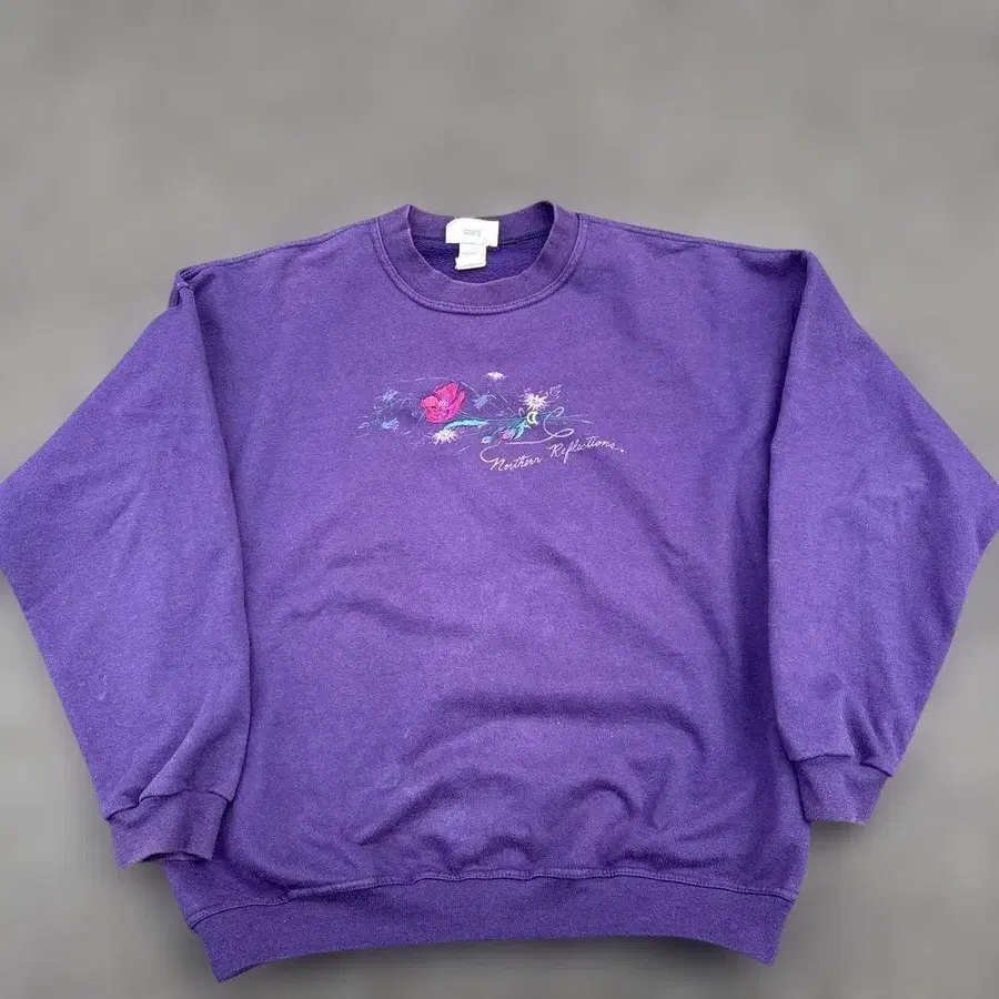 보라색 트레이닝복에 꽃 자수가 놓여 있습니다.