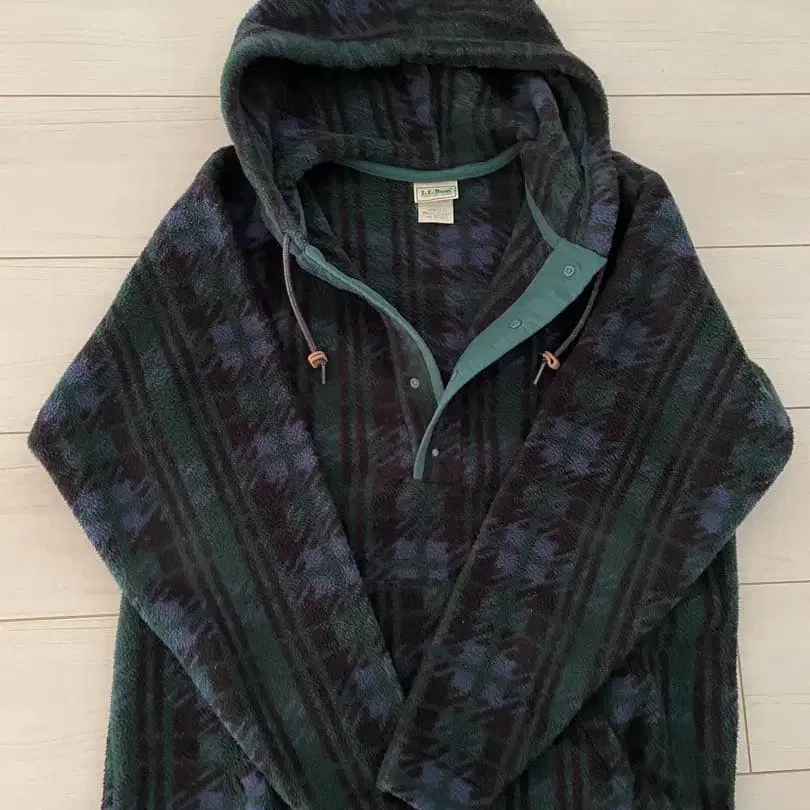 플리스 소재의 후드 부착 풀오버, 그린 계열의 패턴이 특징. 약 30년 전에 카탈로그 오더로 미국에서 개인 수입한 것입니다. 택을 확인한 결과 USA 제조였습니다. 특별히 눈에 띄는 얼룩이나 흠집은 없지만, 오래된 것이므로 '약간의 흠집 있음' 카테고리로 하고 있습니다. - 색상: 그린 계열 패턴 - 디자인: 후드 부착, 풀오버 타입 - 소재: 플리스 - 특징: 버튼이 달린 입구, 조절 가능한 밑단 - 스타일: 캐주얼