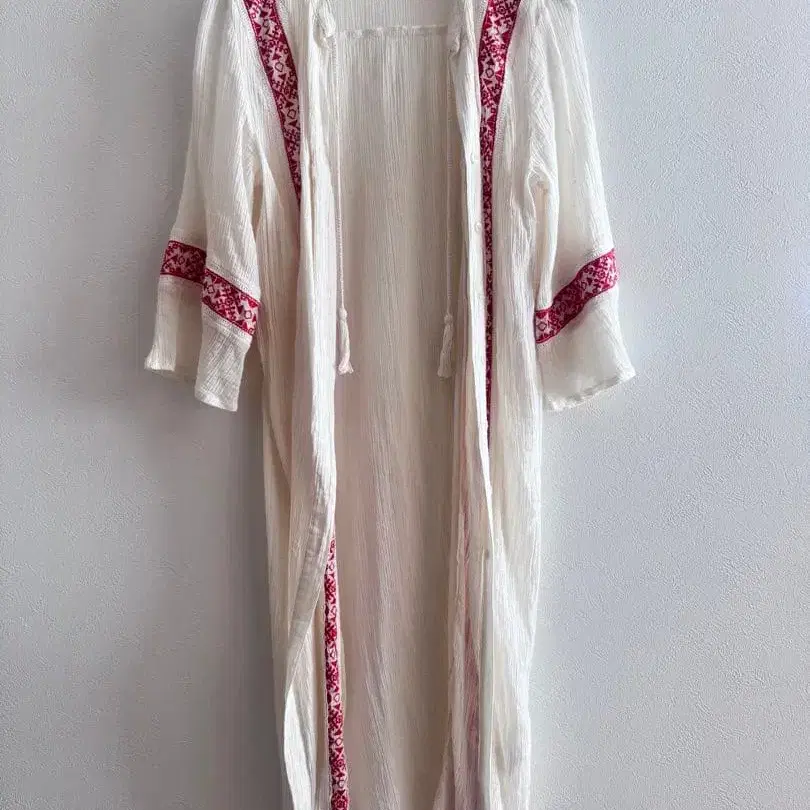 인도 면 자수가 들어간 화이트 코튼 긴팔 가디건입니다. 무늬는 빨간색으로 귀엽습니다 ♡ 여러 번 착용했기 때문에 신경 쓰이는 분은 구매를 자제해주세요(⋆ᴗ͈ˬᴗ͈)'