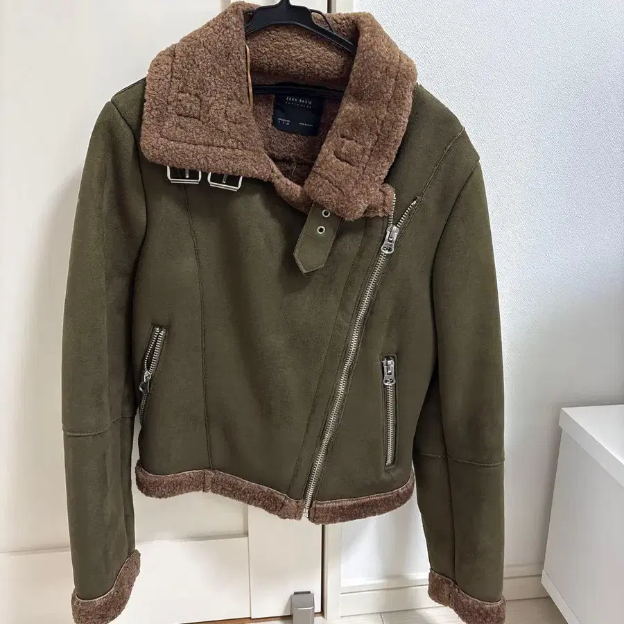 자동 번역되었어요. 원문보기올리브 그린 무스탕 코트, 보아 옷깃과 밑단, 지퍼 디자인.
