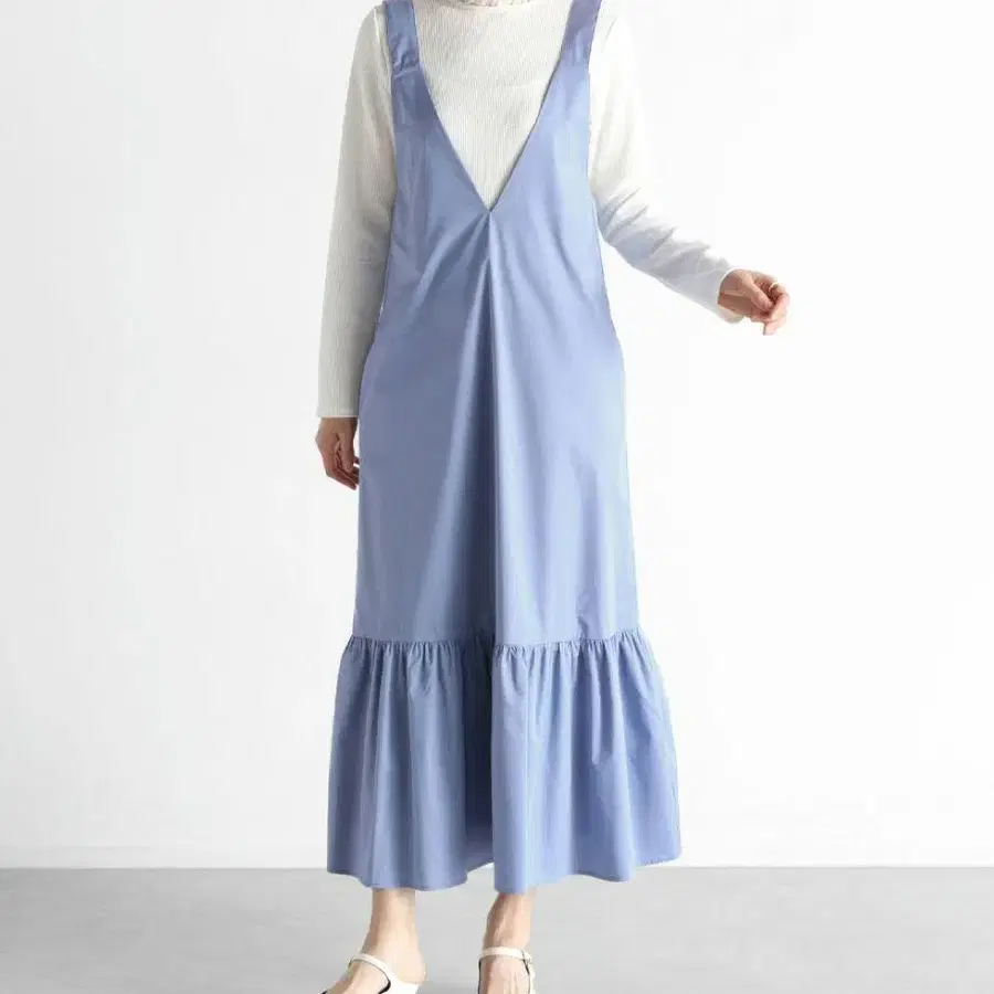 해당 상품은 깊은 V넥이 얼굴 주변을 깔끔하게 보여주며 여성스러움을 돋보이게 하는 티어드 오버롤 스커트입니다.