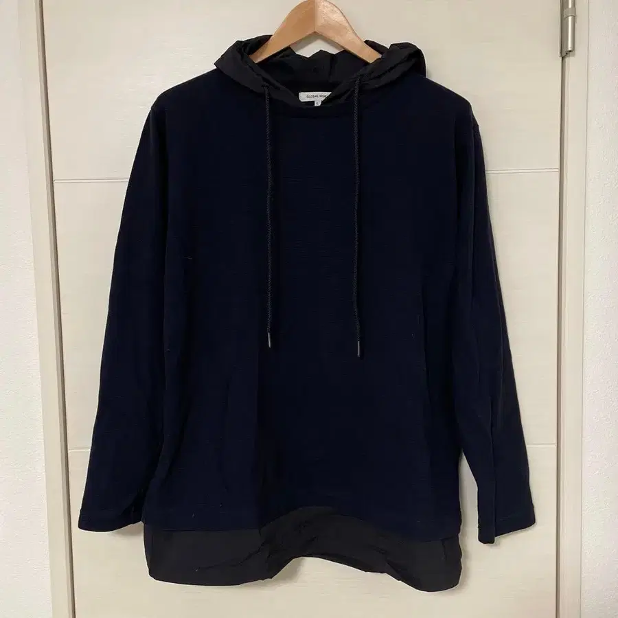 후드 부착 네이비 후드티, 다른 소재 디자인으로 캐주얼 스타일에 최적.