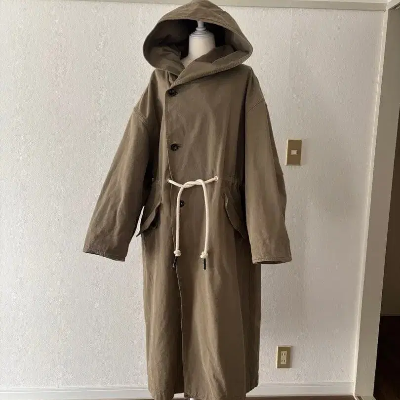프랑스군의 리프로 소재로 선염된 두꺼운 원단의 캔버스를 사용한 롱 후드 코트.