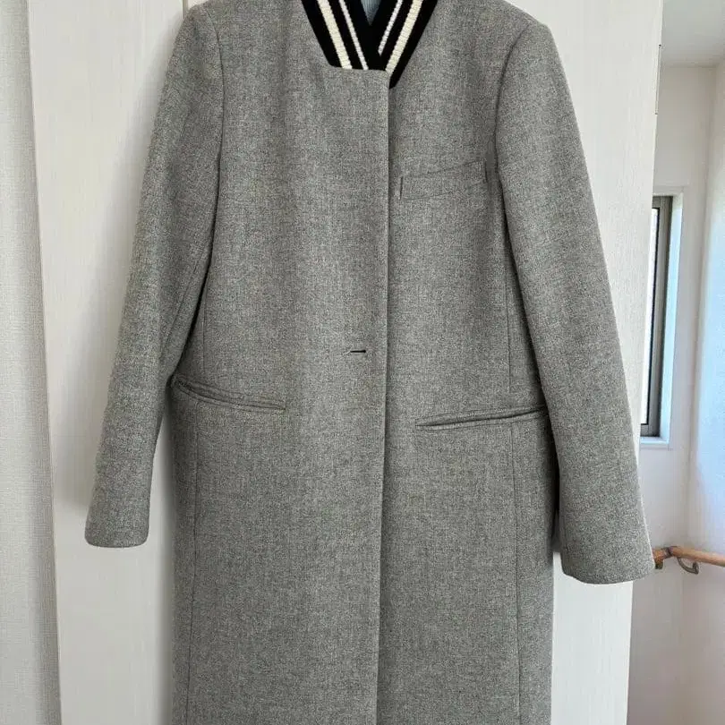 스트라이프 옷깃이 특징인 그레이 울 혼방 코트. - 브랜드: PHEENY - 색상: 그레이 - 디자인: 스트라이프 옷깃 - 소재: 울 혼방 - 스타일: 코트 방문해 주셔서 감사합니다.