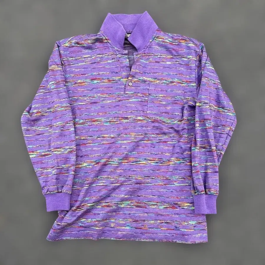 보라색 스트라이프 패턴의 긴팔 피케 셔츠, 가슴 포켓 부착.