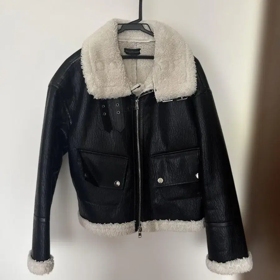 합성 피혁 소재의 보아 옷깃 레더 자켓, 프론트 포켓 부착.
