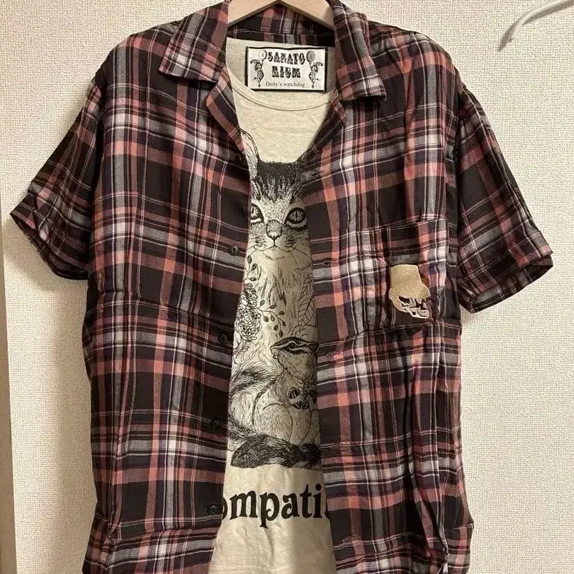 체크 무늬 반팔 셔츠, 가슴 포켓과 뒷면의 그래픽 프린트가 특징입니다.