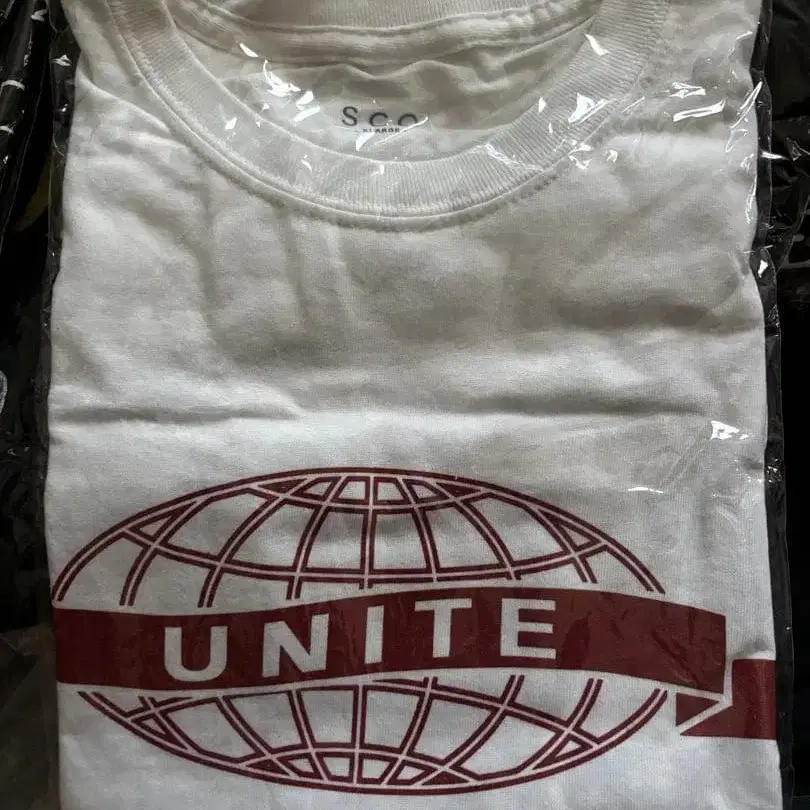 지구본 로고와 UNITE 디자인이 특징인 XL 사이즈 T셔츠.