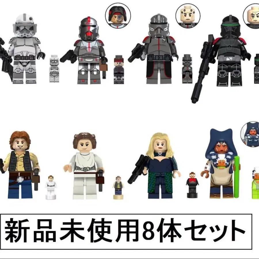 미개봉 새상품 완구입니다. 레고로 바로 가지고 놀 수 있습니다. 이미지에 있는 것이 모두 부속됩니다. 2점부터 가격 인하 가능하며, 세트 판매만 가능합니다. ※ 최저가 발송 방법으로 보내드립니다. 박스 없음, 조립 없음 상태로 피규어마다 봉투에 담아 보내드리니 양해 부탁드립니다. 생일 선물로 최적입니다. 99 트루퍼 클론 포스 한 솔로 레아 아소카