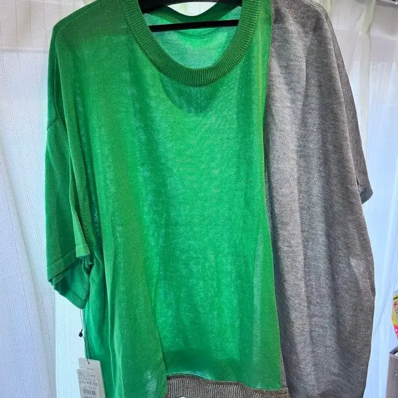 정가 16500엔의 새상품을 반값 이하로 양도합니다! 선명한 그린과 그레이의 바이컬러에, 리브 편직 밑단이 특징인 경량 돌먼 니트입니다! - 색상: 그린과 그레이의 콤비네이션 - 디자인: 반팔, 라운드넥 - 밑단: 리브 편직 밑단 - 소재: 경량으로 통기성이 있는 원단