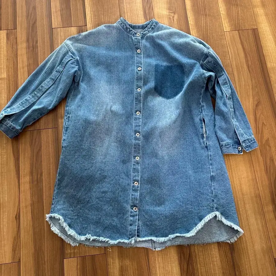 데님 소재의 버튼이 달린 셔츠 원피스, 프린지 밑단으로 캐주얼한 인상을 줍니다.