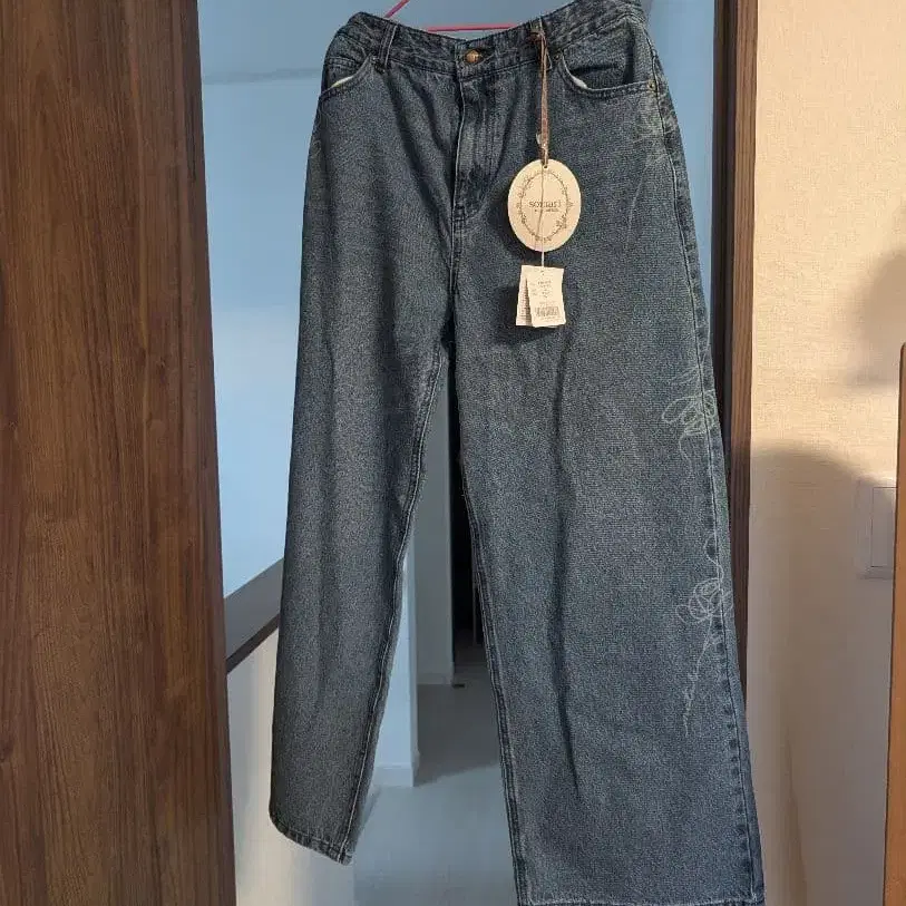 자수 디자인 와이드 레그 데님 3L 블루